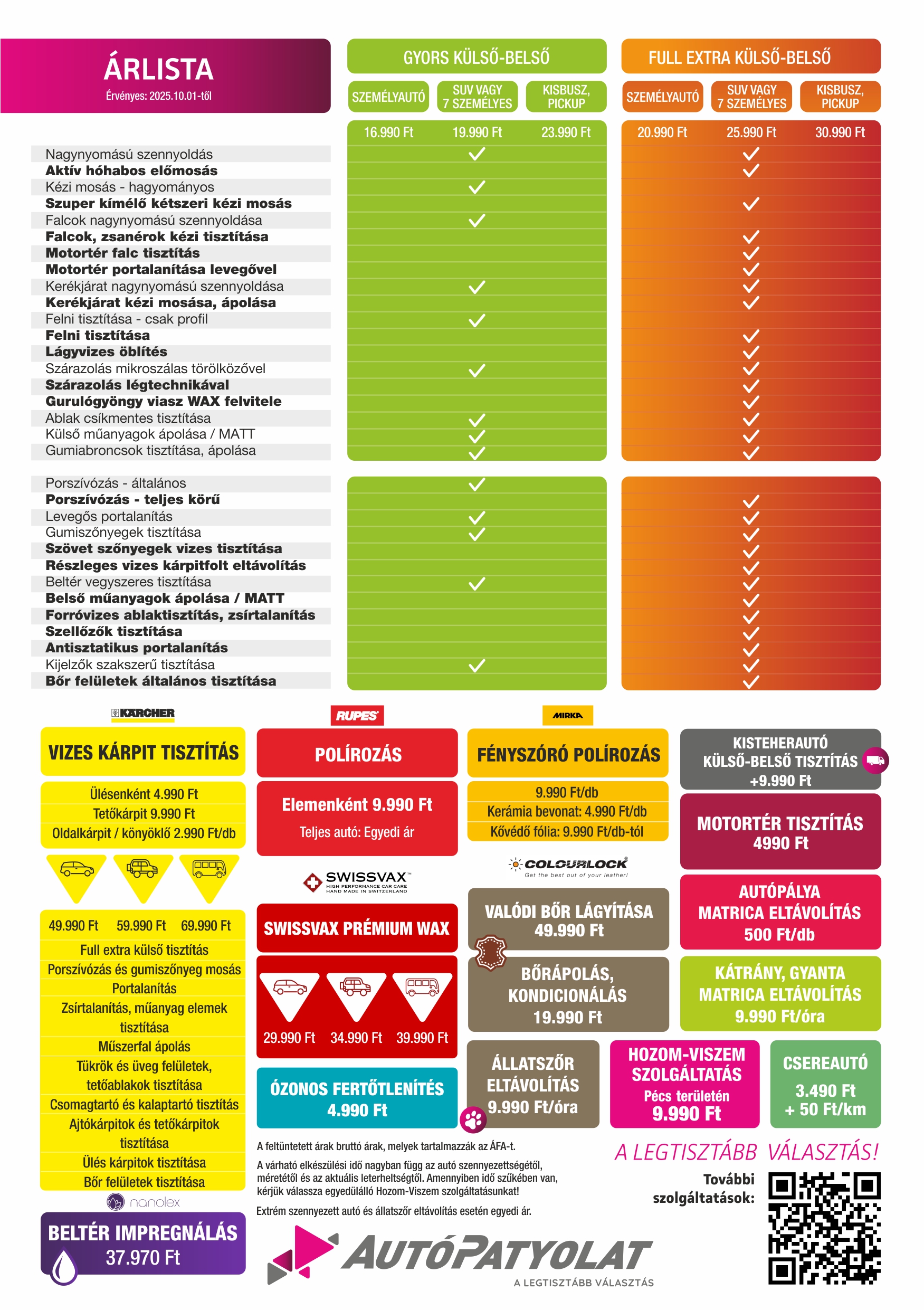 FONTOS: Nincs két egyformán szennyezett autó, viszont áraink szennyezettségtől függetlenek*, fixek. Kedvező fix árainkat tarthassuk fix normaidőt alkalmazunk függetlenül a szennyezettségtől, tehát a kiválasztott szolgáltatás idejét tartva legjobb tudásunk szerint járunk el, ami ebbe az időbe belefér kitérünk és elvégzünk. Ez praktikusan annyit jelent, hogy előfordulhat olyan, hogy marad pár helyen sajnos még szennyeződés, igyekszünk mindenre egységesen figyelmet fordítani. Kérjük ennek tudatában válasszák ki az Önök számára legmegfelelőbb szolgáltatásunkat. További információkat az ÁSZF. és a Házirendünk tartalmaz. Megértésüket köszönjük!